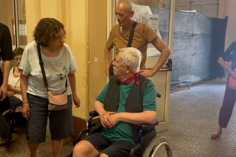 9 anziani restano seduti in attesa di poter votare nell'ingresso