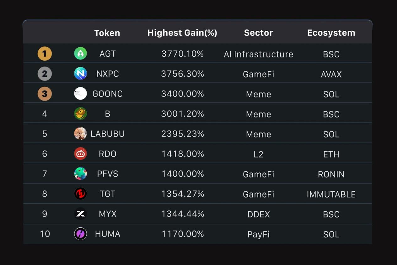 Some of the strongest gains came from sectors that continue to define the next market cycle. AI infrastructure token AGT posted a peak gain of +3,770.10%, followed closely by blockchain gaming project NXPC (+3,756.30%) and PayFi protocol HUMA (+1,170.00%).