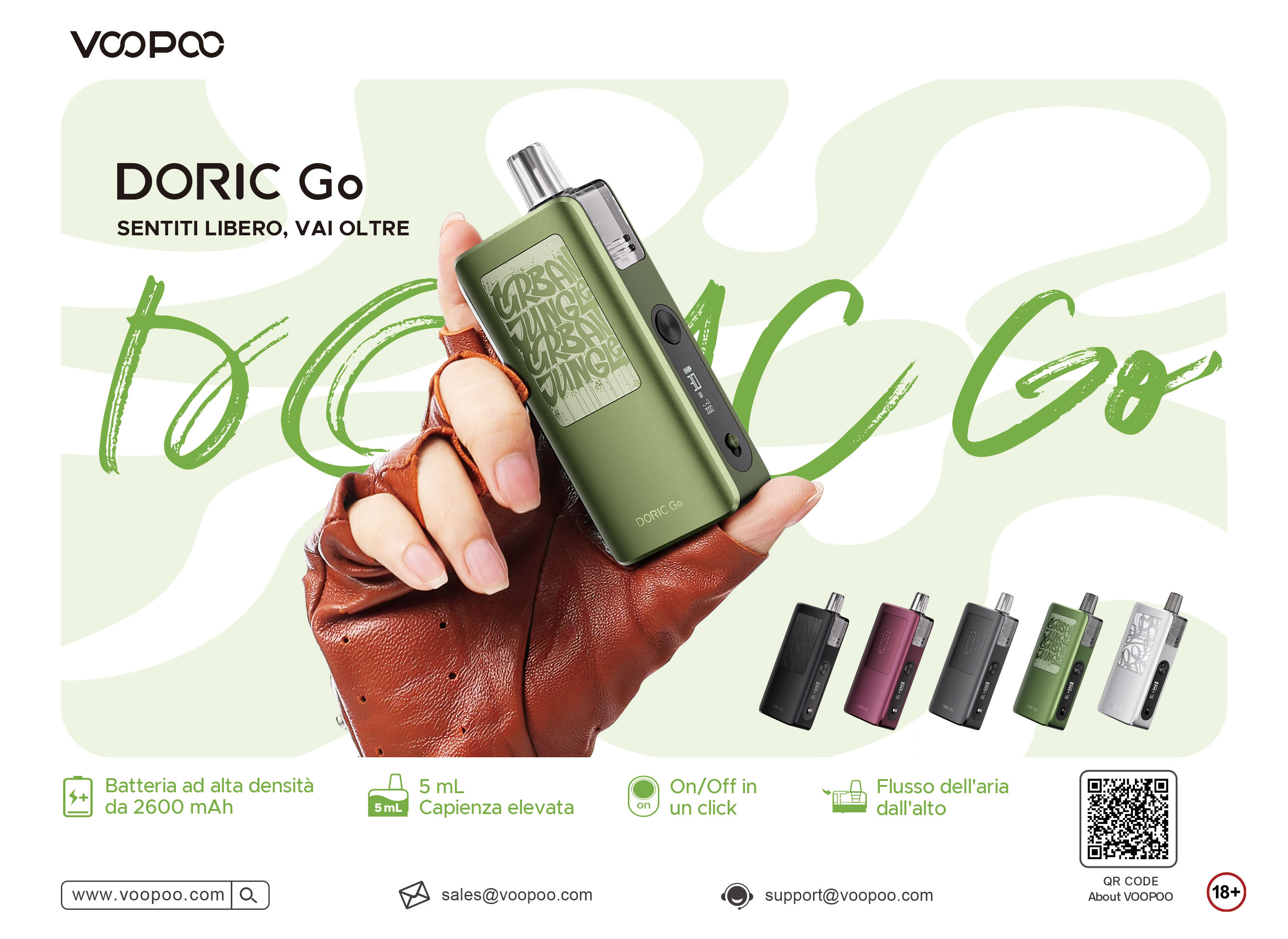 Con l'inizio del 2026, VOOPOO fa un ingresso di grande impatto con il suo innovativo DORIC Go. Lo slogan è “Go Free, Go Beyond”, che possiamo tradurre “Vai Libero, Vai Oltre”. Questo prodotto è progettato meticolosamente per soddisfare le attuali esigenze degli utenti in termini di durata della batteria, stile unico e praticità. Come parte delle diverse famiglie di prodotti VOOPOO, DORIC Go è un sistema POD progettato non solo per stare al passo con le esigenze quotidiane, ma per ridefinirle. È pensato per gli utenti che vedono il proprio dispositivo come un'estensione del proprio stile personale e una fonte affidabile di piacere.
